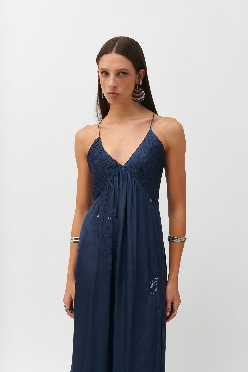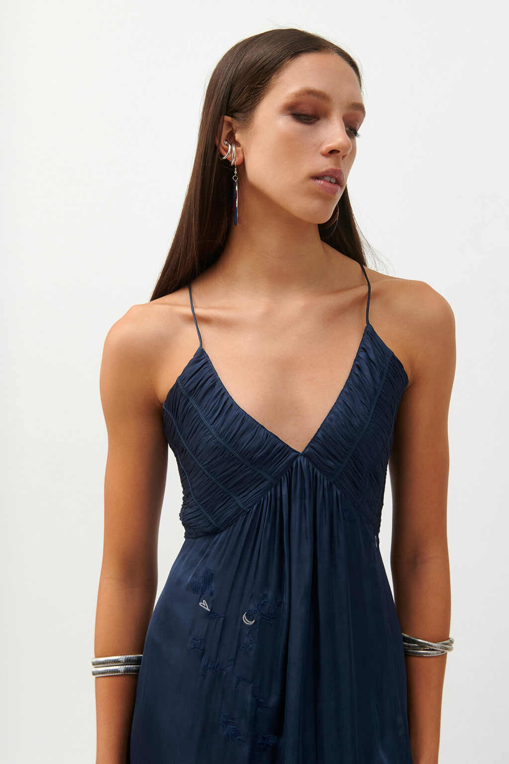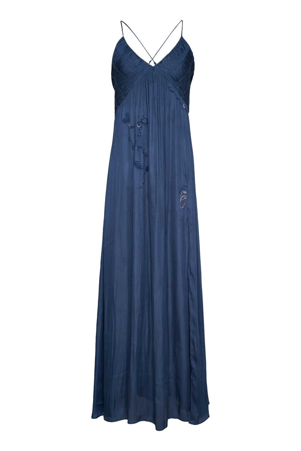 – Μακρύ, σατινέ φόρεμα σε navy απόχρωση από την Cloud 9 By L