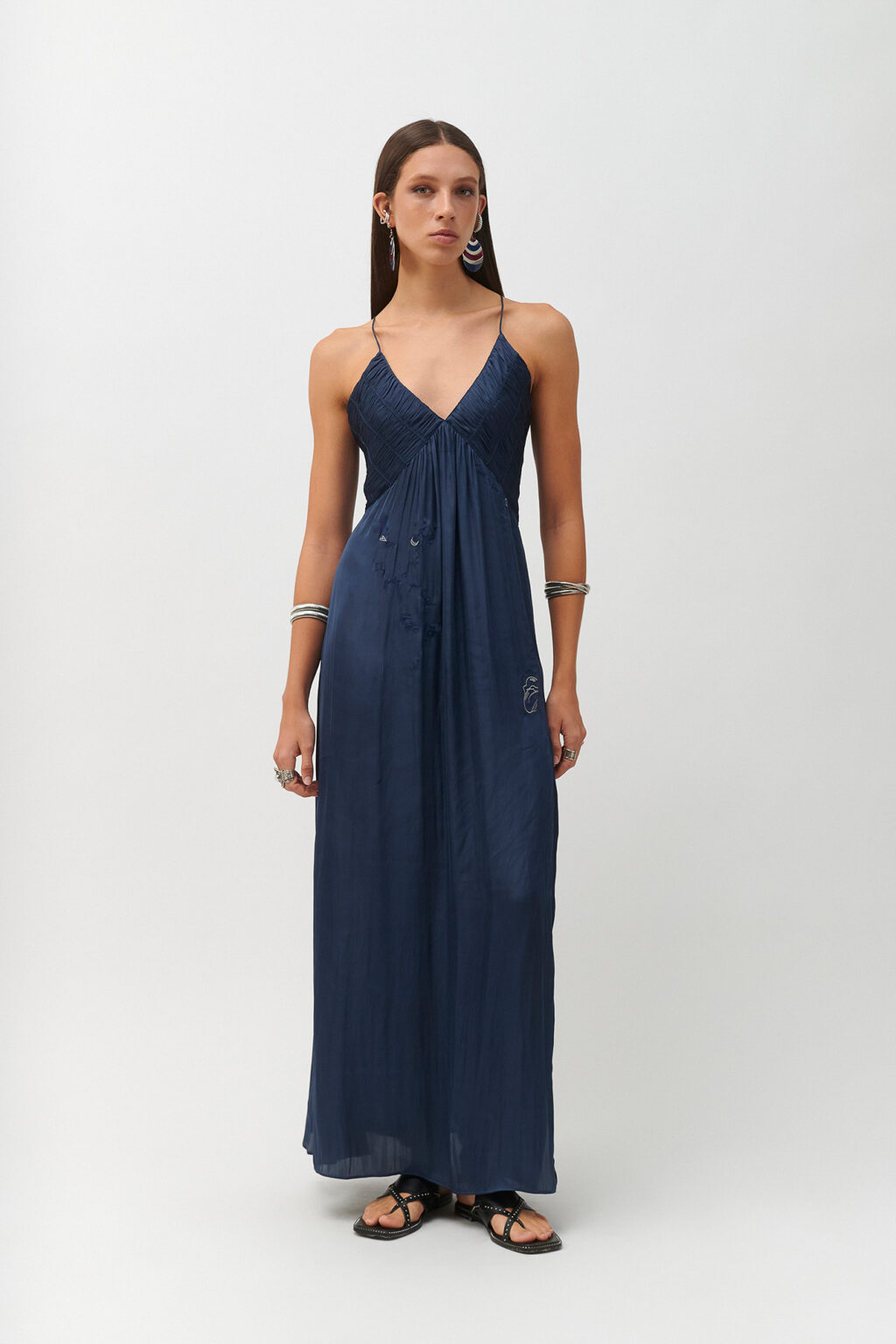 Οι λεπτές τιράντες δημιουργούν μια εκλεπτυσμένη σιλουέτα, ενώ η μακριά, αέρινη φούστα χαρίζει κίνηση και χάρη σε κάθε βήμα. Οι διακριτικές καλλιτεχνικές λεπτομέρειες ολοκληρώνουν το σχέδιο, προσθέτοντας έναν ιδιαίτερο και σύγχρονο χαρακτήρα.