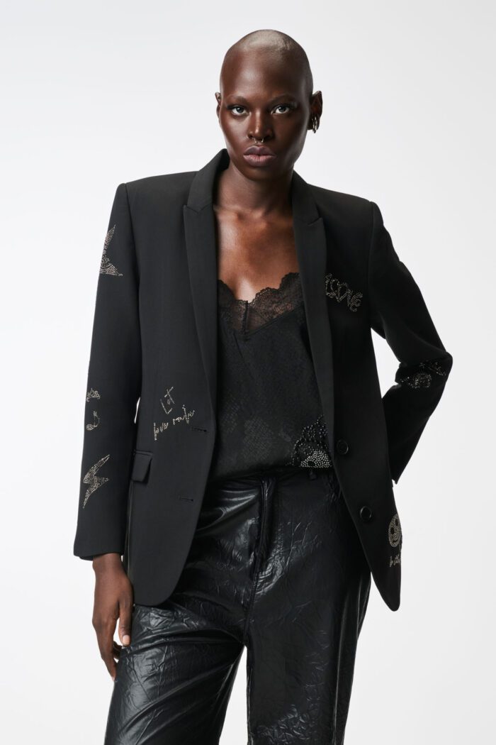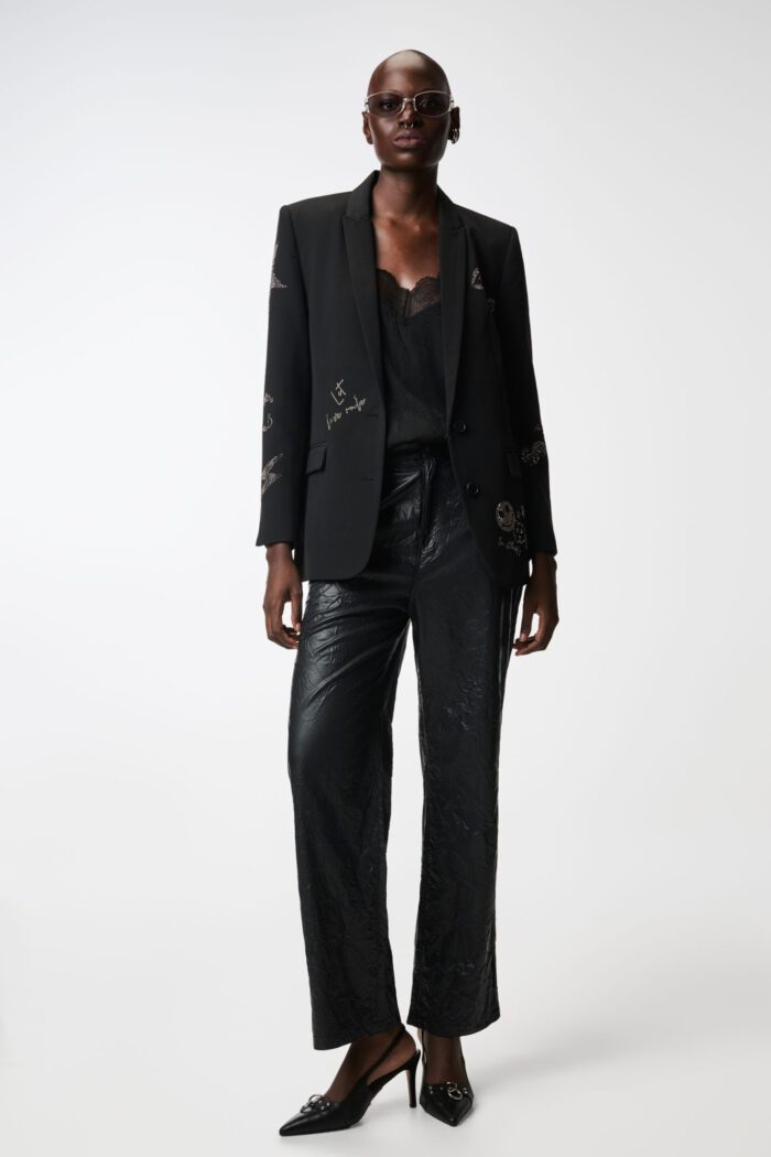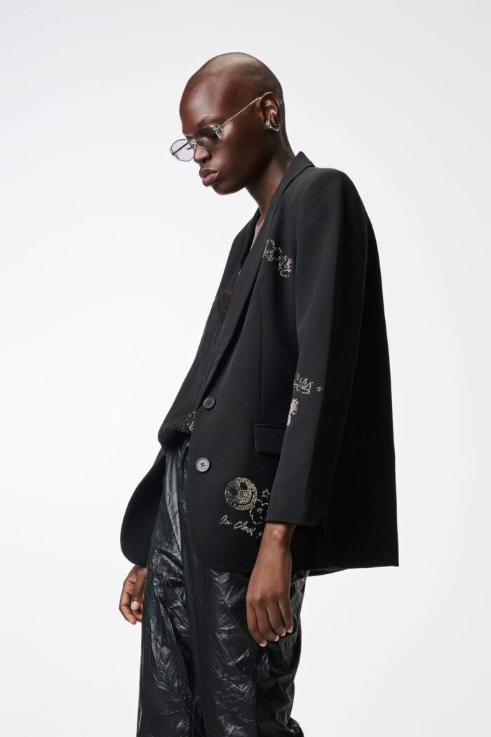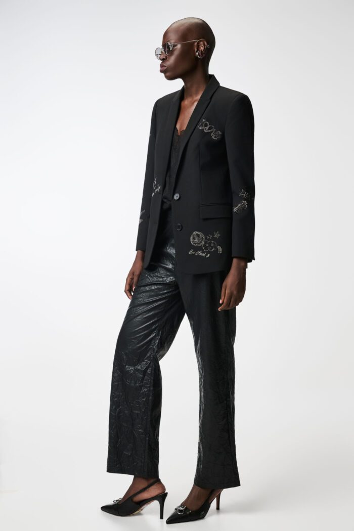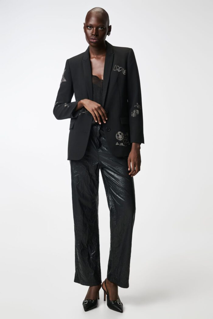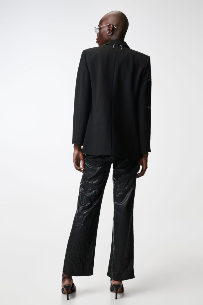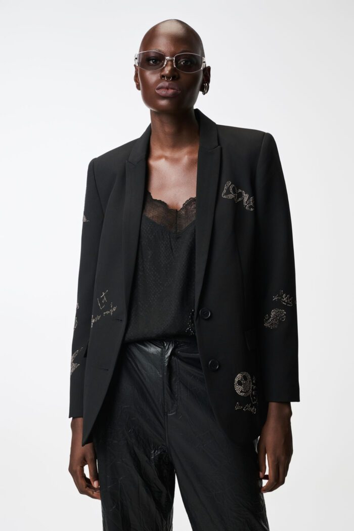 Το μοντέρνο tailoring έχει μπει στη μόδα. Γνωρίστε το Space σακάκι. Το προσεκτικά κατασκευασμένο ύφασμα έχει υφανθεί από Japanese Mill, χρησιμοποιώντας υλικό με διακριτική υφή για να δημιουργήσει ένα απαλό ύφασμα. Κομμένο σε μονόπετο σχήμα σε χαλαρή εφαρμογή με εντυπωσιακά graffiti στρας C9 – συνδυάστε το με το δερμάτινο παντελόνι και είστε έτοιμες.