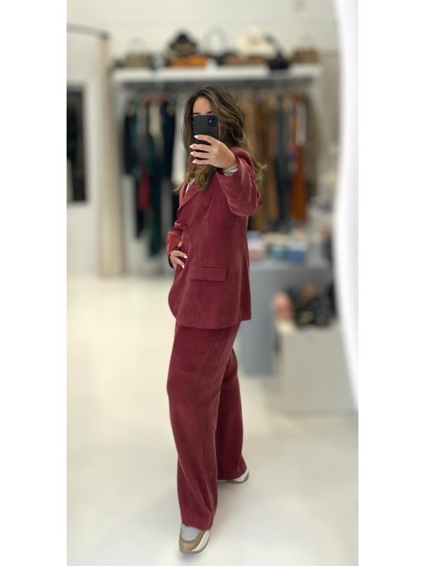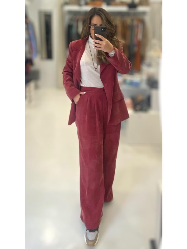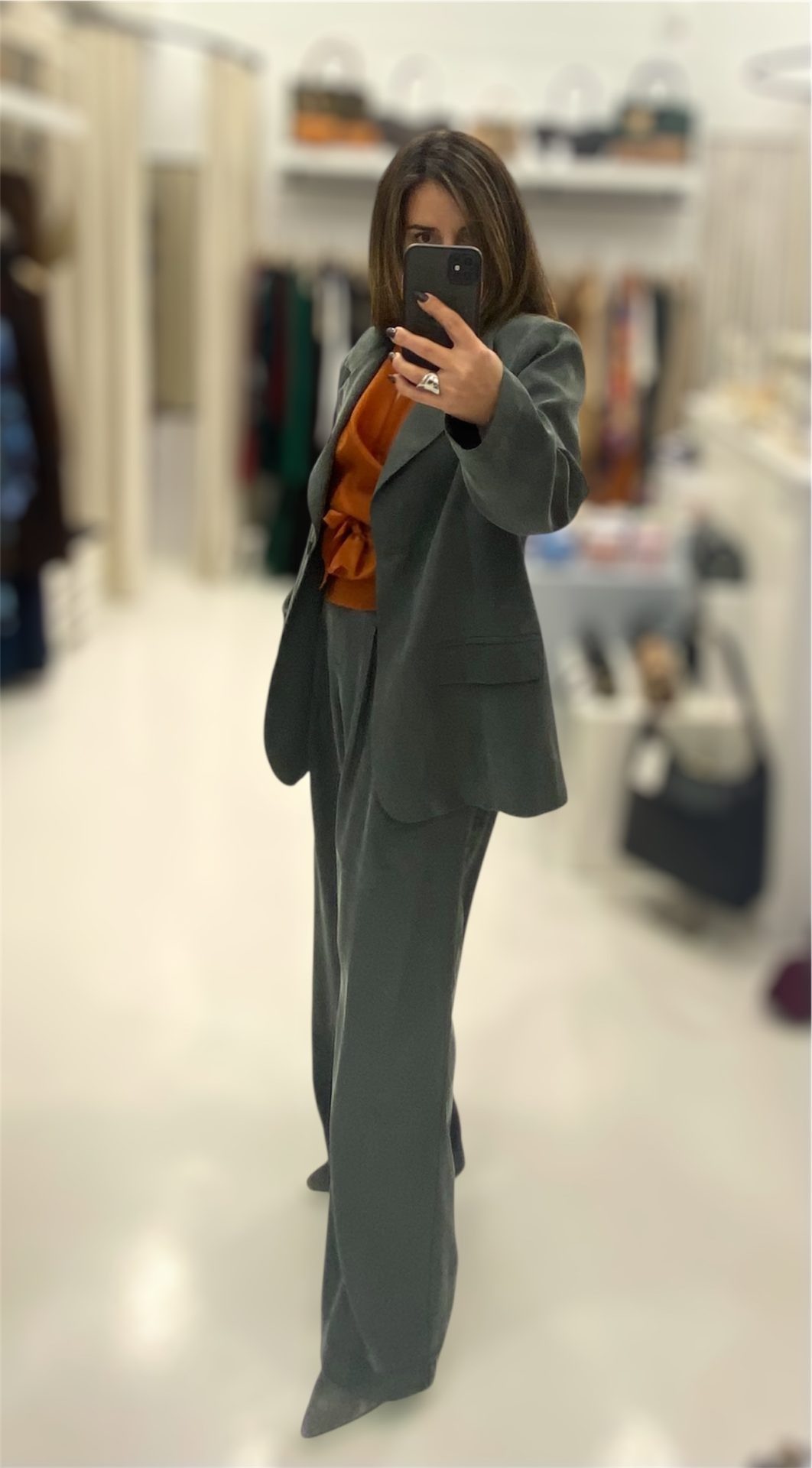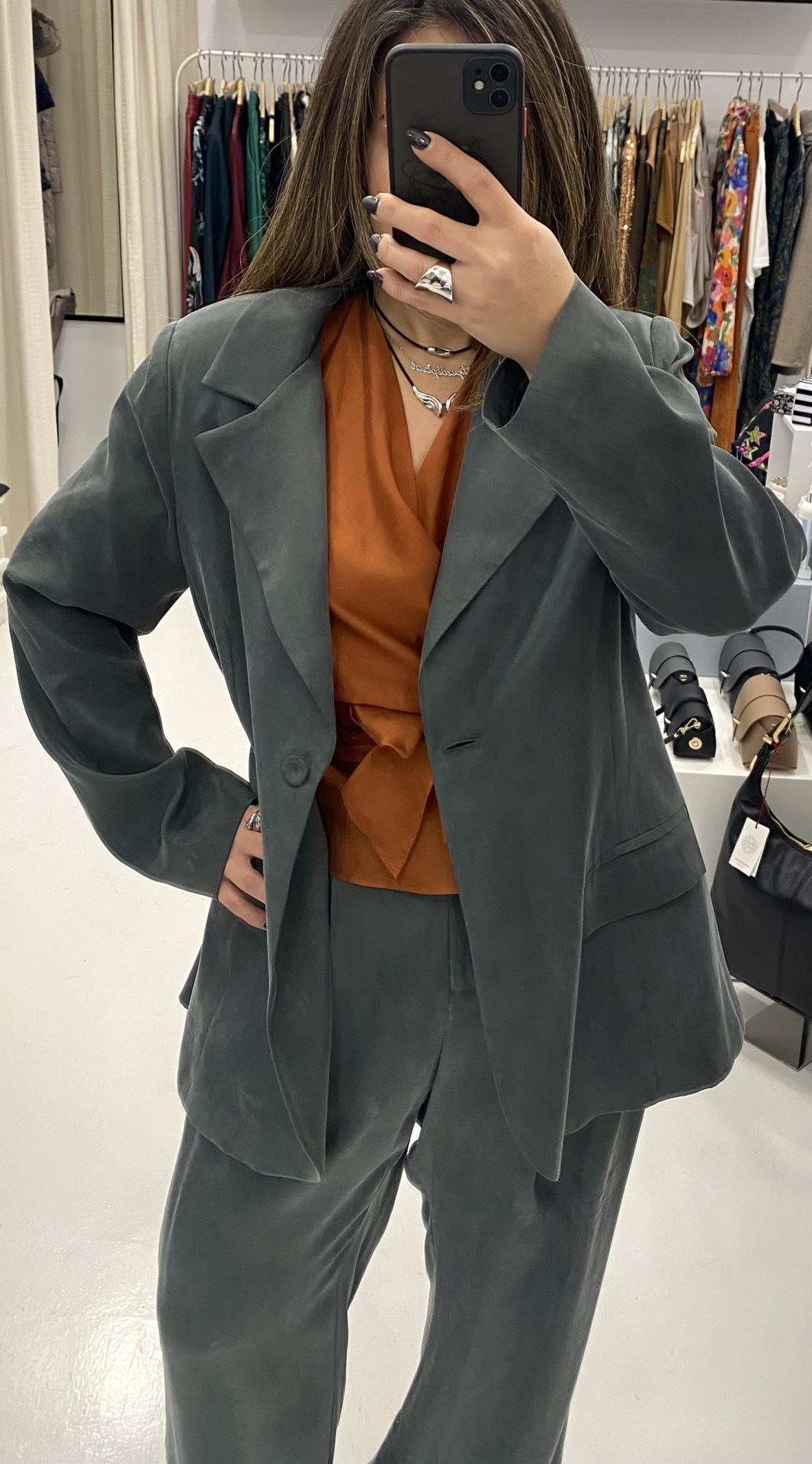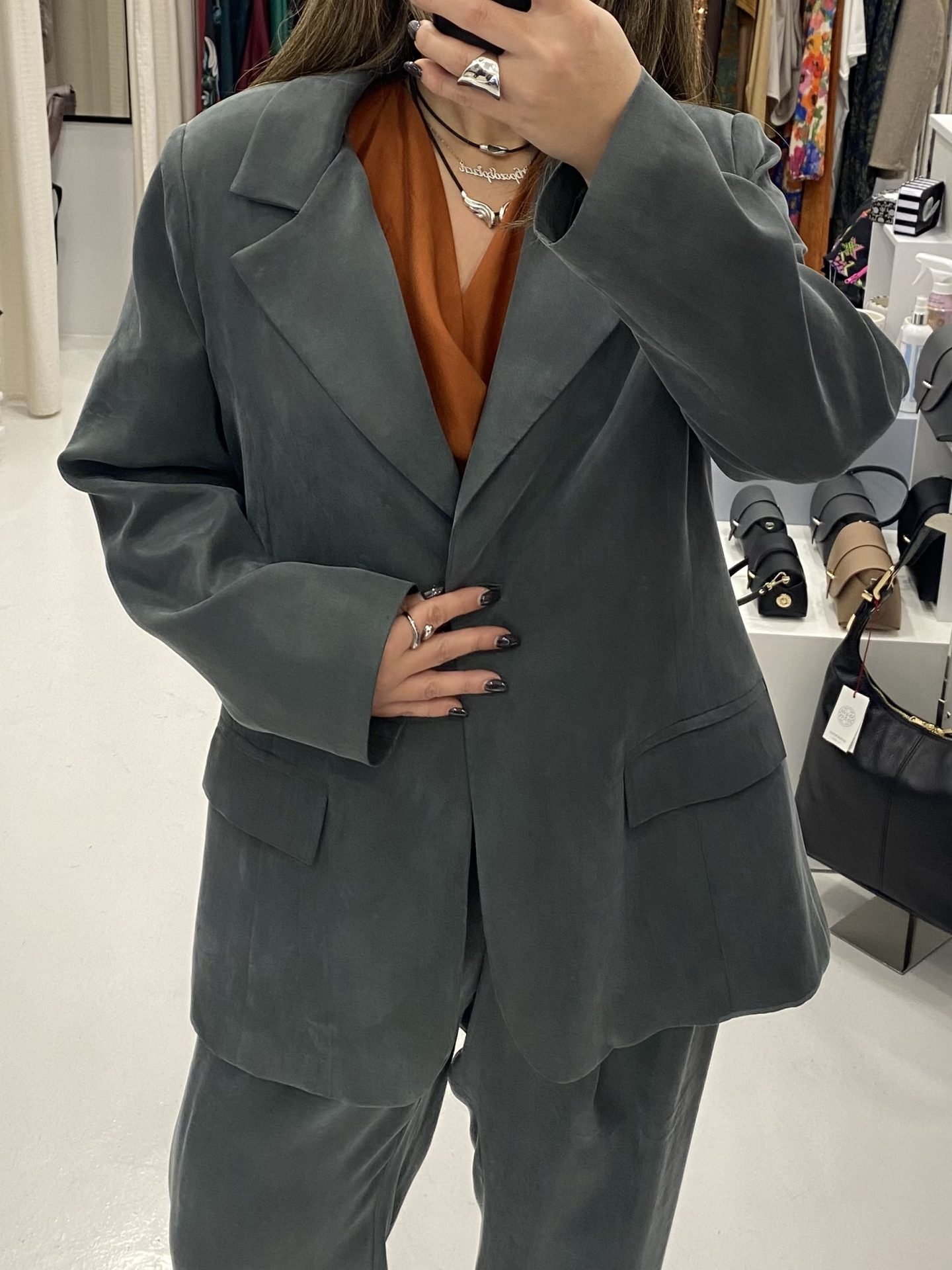 Χειροποίητο oversized ανδρόγυνο κοστούμι που αποτελείται από σακάκι ίσιας γραμμής με τσέπες, από εντυπωσιακό μαλακό και ελαφρύ ύφασμα που χαρίζει την όψη μάτ μεταξωτού και ταυτόχρονα βελούδινου φινιρίσματος. Το σακάκι με ένα κουμπί θεωρείται πολύ κολακευτικό γιατί δημιουργεί ένα βαθύ σχήμα “V” το οποίο επιμηκύνει τον κορμό και τονίζει τη μέση.