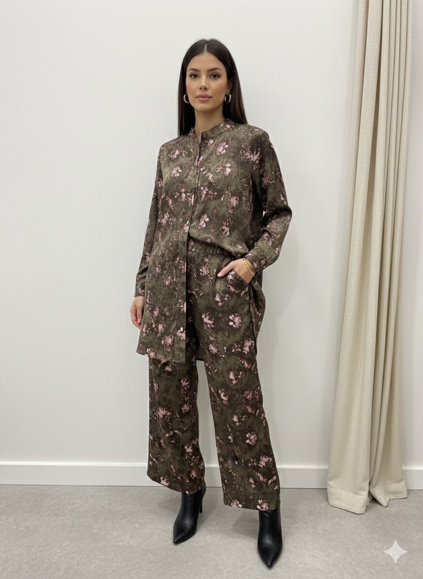 Εντυπωσιακό silky touch set που αποτελείται από μακρυά πουκαμίσα με μανσέτες και μάο γιακά , καθώς και ψηλόμεση ισόφαρδη παντελόνα με λάστιχο στη μέση.