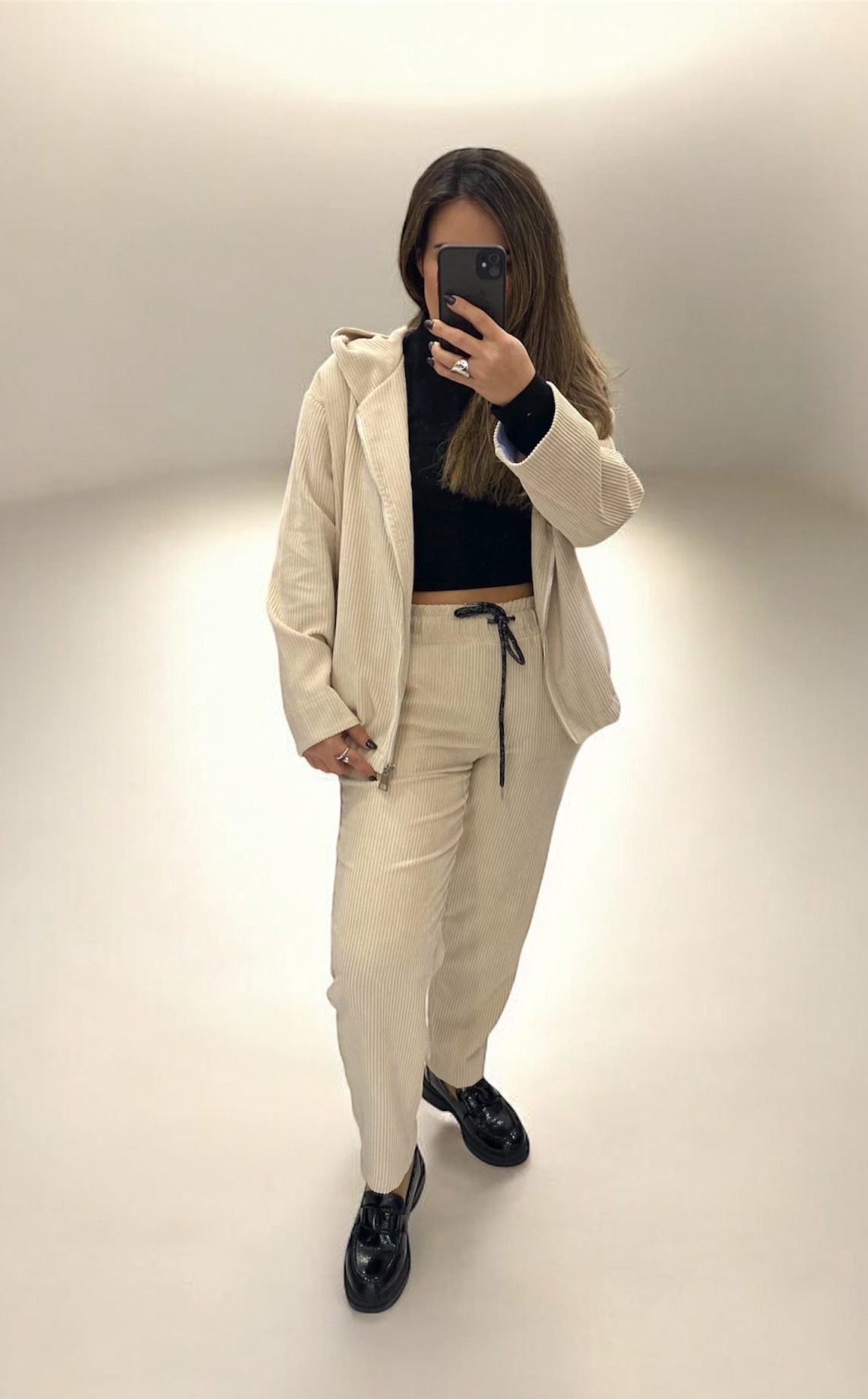 Ιταλική φινέτσα και θηλυκές γραμμές από τη Le Streghe. Κομψό και άνετο κοτλέ σε λεπτή ρίγα jacket με πλαινές τσέπες κουκούλα και φερμουάρ, πολύ μαλακό ύφασμα. Υπέροχη εφαρμογή, για ακόμη πιο εντυπωσιακό αποτέλεσμα συνδυάστε το με το παντελόνι του.