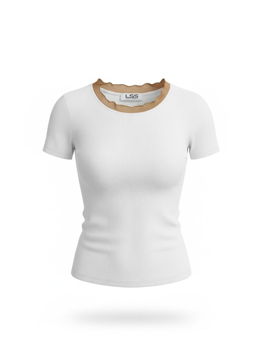 Ιταλική φινέτσα και θηλυκές γραμμές από τη Le Streghe. Rib ελαστικό tshirt με διακοσμητική λεπτομέρεια σε camel-beige χρώμα γύρω από το λαιμό.