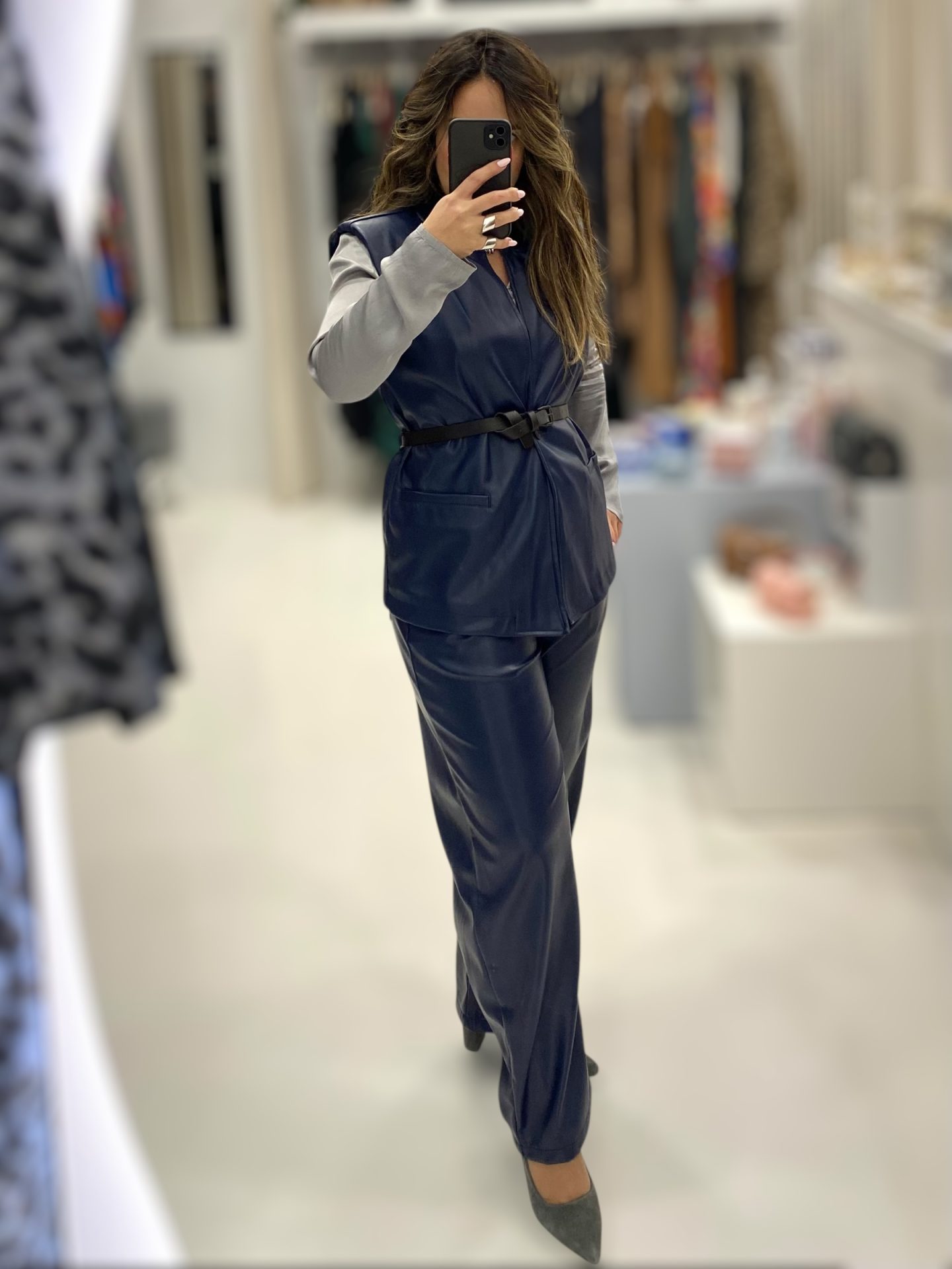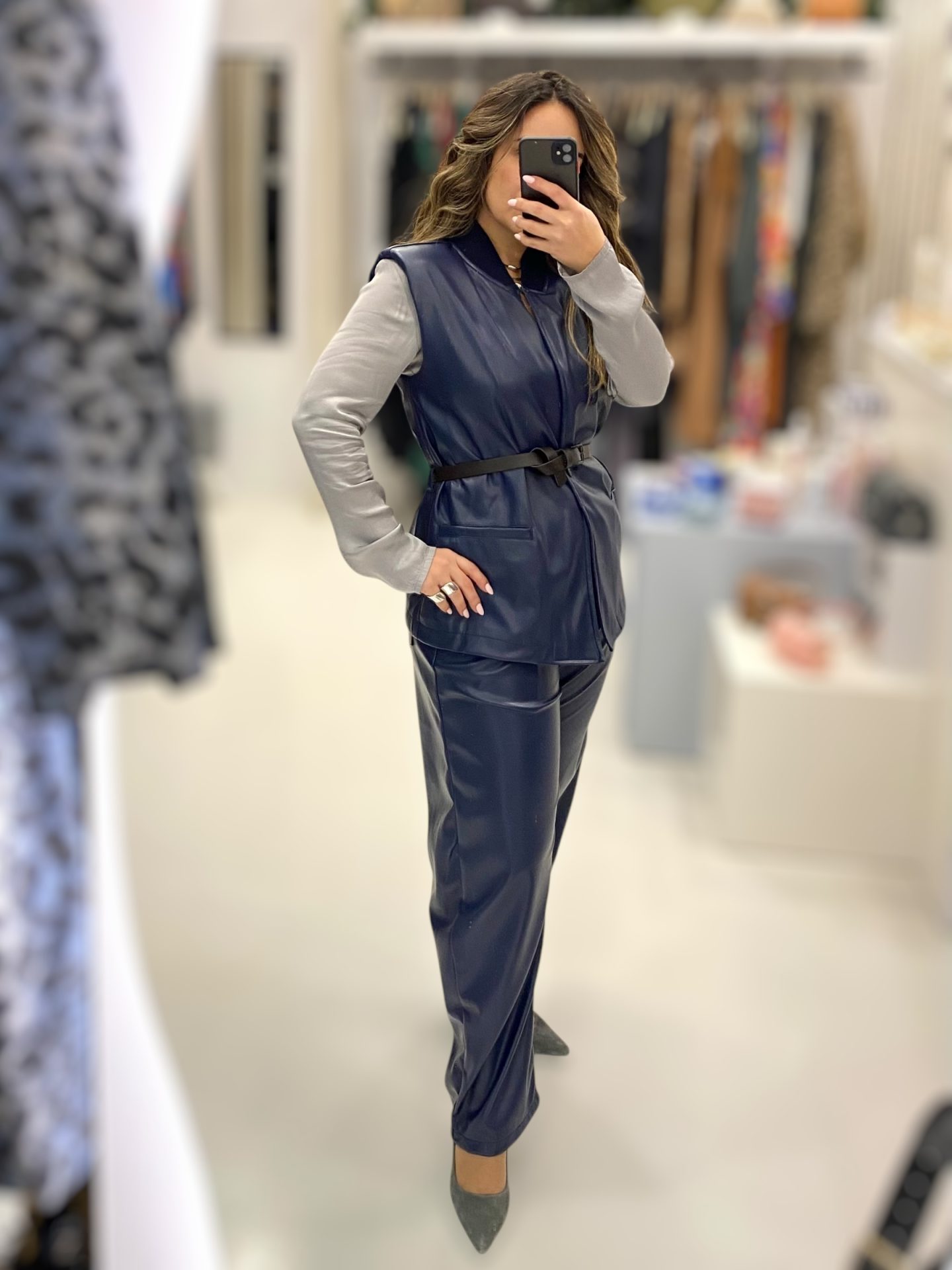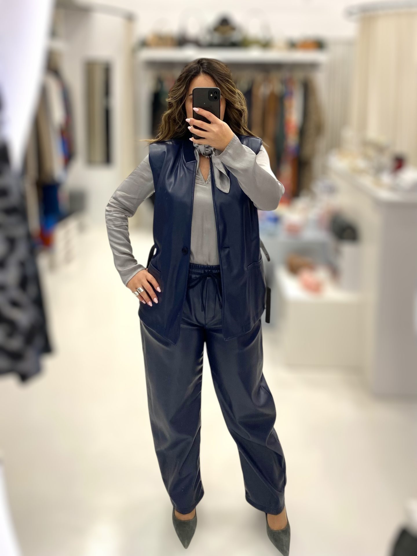 Ιταλική φινέτσα και θηλυκές γραμμές από τη Le Streghe. Εντυπωσιακό vest δερματίνης, πολύ μαλακό με βάτες και ζωνάκι, άνετης γραμμής και τσέπες. Συνδυάστε το με το barrel παντελόνι τ0υ για ακόμη πιο εντυπωσιακό look
