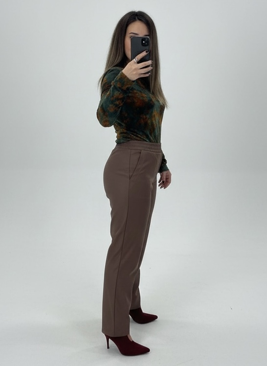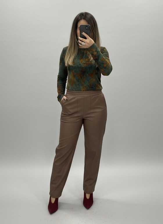 Παντελόνι δερματίνης, κανονικής εφαρμογής, πλαϊνές τσέπες και λάστιχο σε όλη τη μέση για όλες τις ώρες, από την εταιρεία Le Vertige.