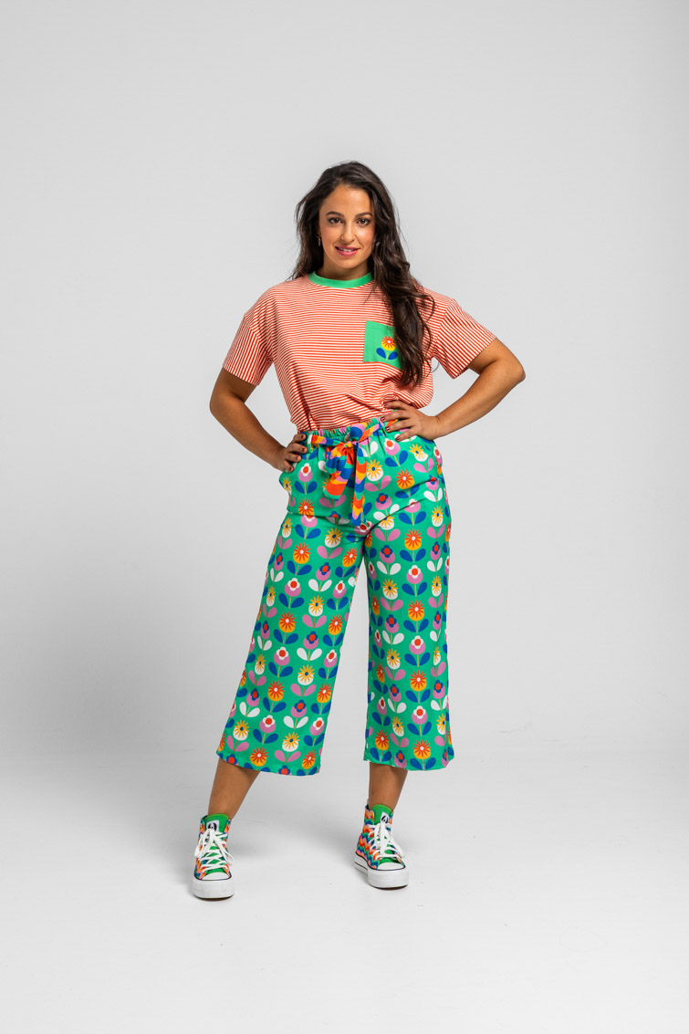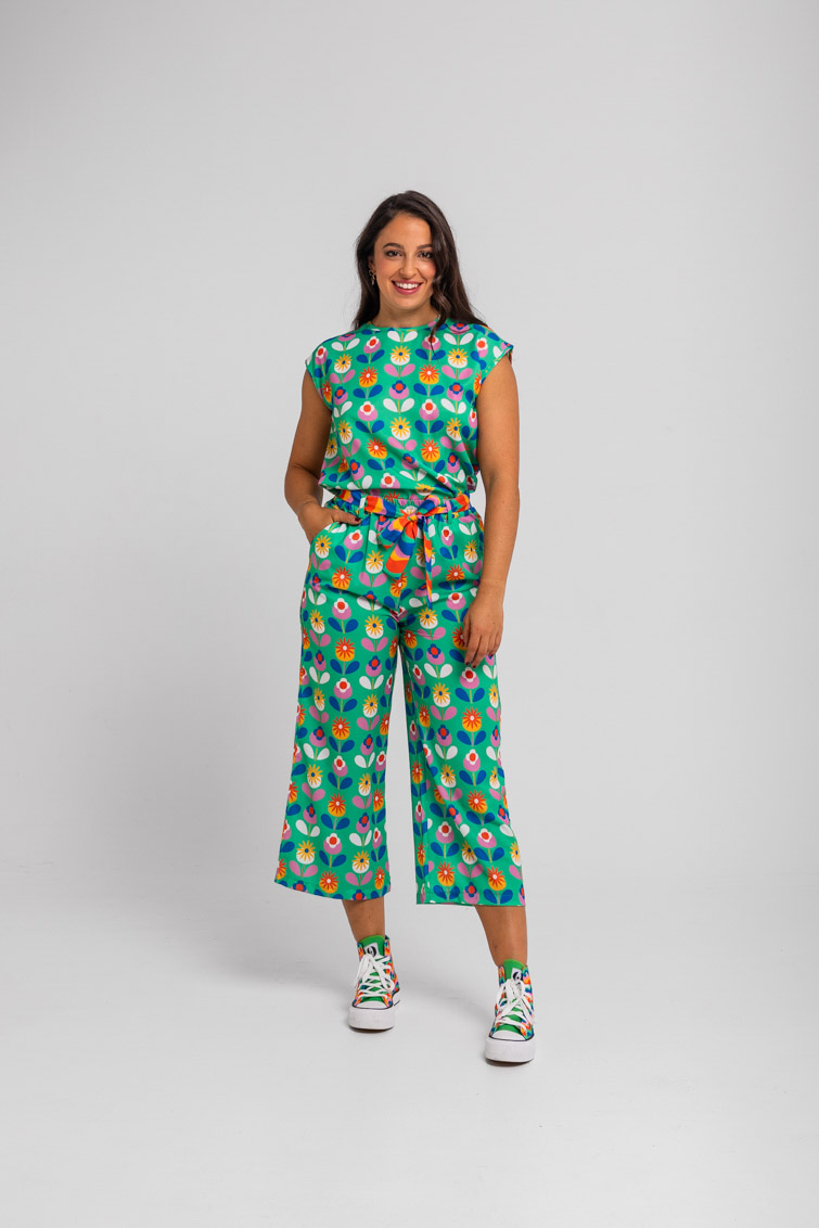 Παντελόνι κιλότ μέχρι τον αστράγαλο, λάστιχο στη μέση, ρυθμιζόμενο δέσιμο και τσέπες.