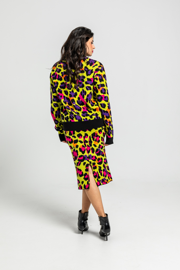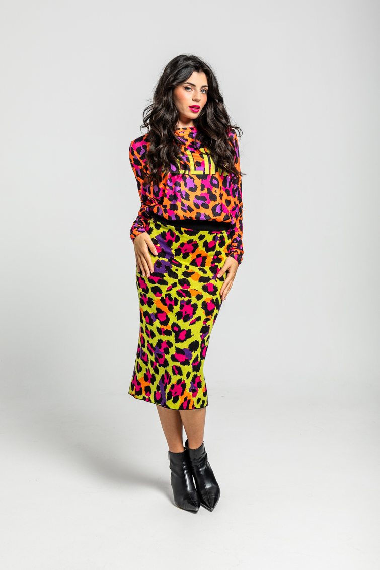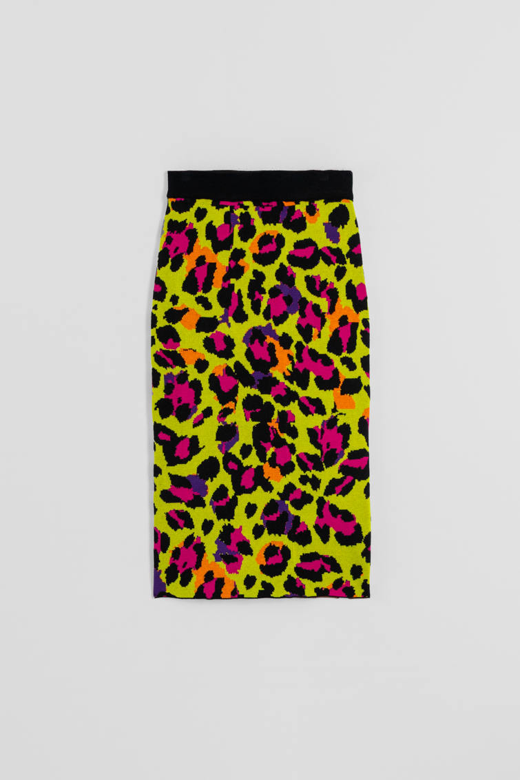 Lolina • I’m Felina Midi Knitted Skirt • Green Yellow Leopard