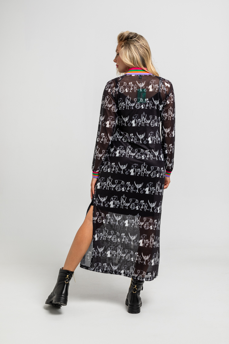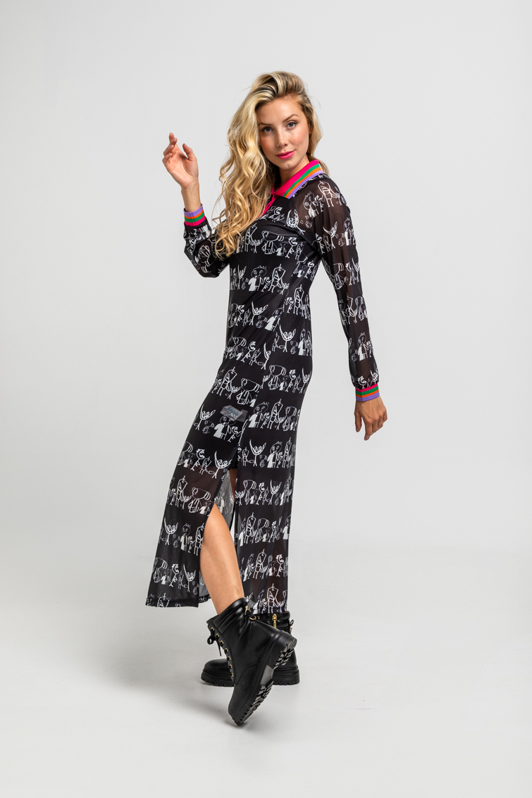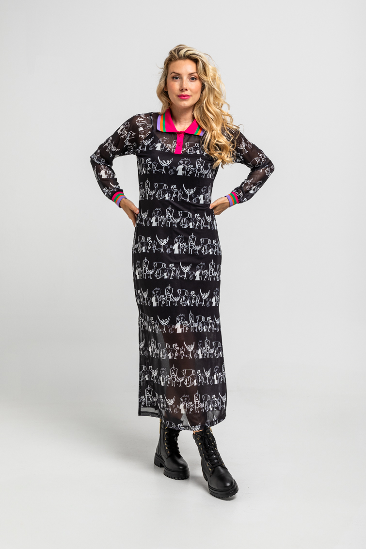 Μακρύ ελαστικό φόρεμα από τούλι με το print Imagine, με κανονική θηλυκή εφαρμογή, ανοίγματα στο πλάι, εξαιρετικά απαλή υφή και χρωματιστό polo γιακά. Συνοδεύεται από sleep dress.