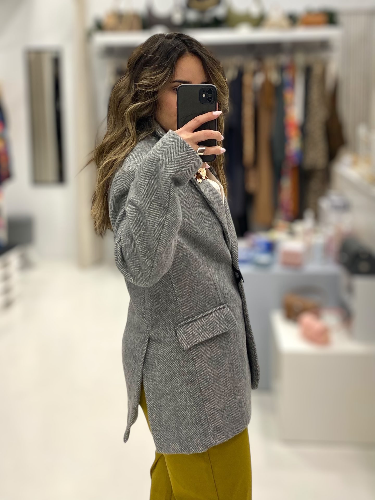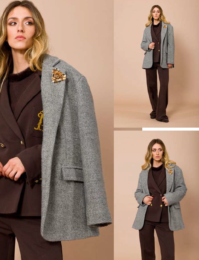 Κομψό γυναικείο σακάκι συνδυάζει την κλασική ραπτική με μοντέρνες λεπτομέρειες και την ιταλική φινέτσα. Το μοτίβο του ψαροκόκαλου σε αποχρώσεις του γκρί και του λευκού προσφέρουν μια πιο σοφιστικέ εμφάνιση. Έχει oversized ίσια γραμμή και δύο κοψίματα στο πίσω μέρος, επιτρέποντας το layering και συνδυασμό με πουλόβερ από μέσα! Γκρι φοδράρισμα, κλασσικός γιακάς με πέτο και διακριτικές τσέπες στο μπροστινό μέρος. Συνοδεύεται από διακοσμητική καρφίτσα σε σχήμα χρυσού τριαντάφυλλου δίνοντας μια πιο θηλυκή και πολυτελή πινελιά στο κατά τ’ άλλα αυστηρό ανδρόγυνο στύλ του σακακιού. Αρκετά ζεστό λόγω σύστασης, για όλες τις ώρες : office look, casual chic ή total grey μονοχρωματική δυναμική εμφάνιση. Μπορείτε να επιλέξετε και ένα νούμερο μικρότερο από το κανονικό σας καθώς έχει αρκετά φαρδιά γραμμή.