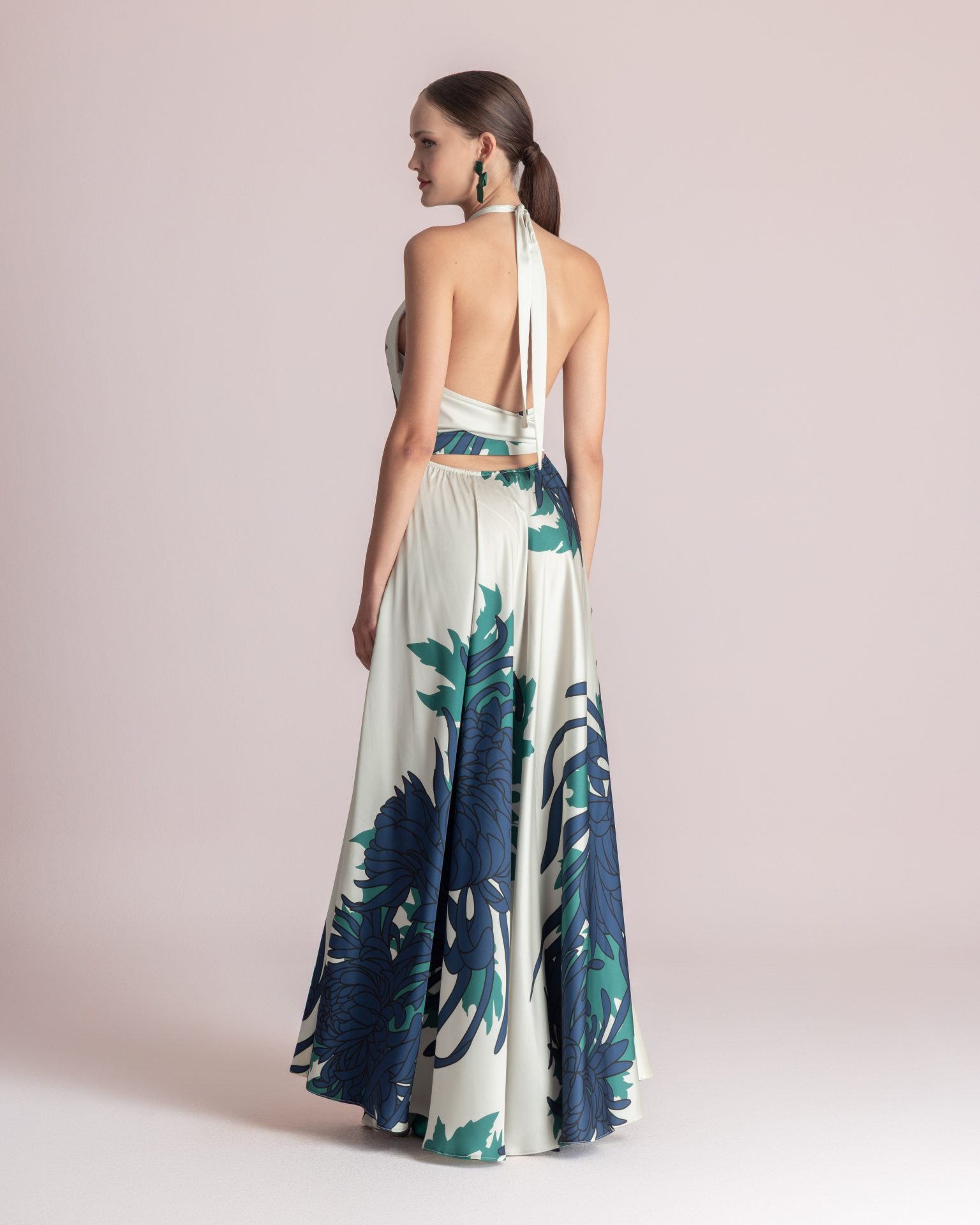 Αέρινο maxi πολύ εντυπωσιακό halter neck φόρεμα με ανοιχτή πλάτη και ενσωματωμένη φαρδιά κορδέλα που δένει πίσω στη μέση.
