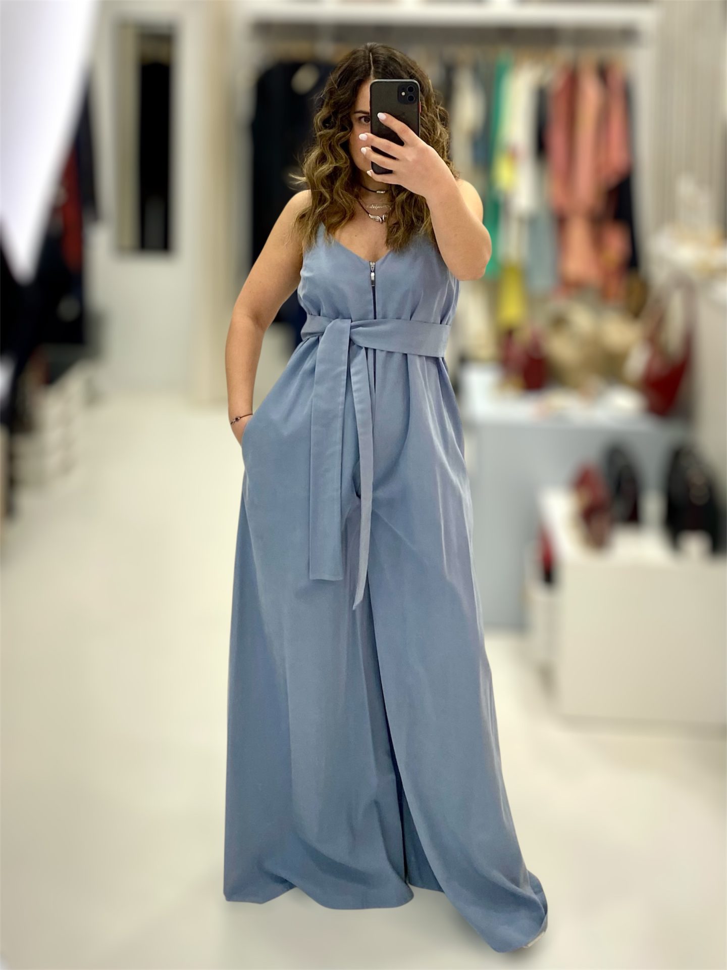Στυλάτη και άνετη oversized ολόσωμη φόρμα με ζώνη, τσέπες, ραντάκια και μπροστινό φερμουάρ. Υπέροχο ύφασμα κούπρο, για όλες τις ώρες. Προτείνεται ένα νούμερο μικρότερο από το κανονικό σας.