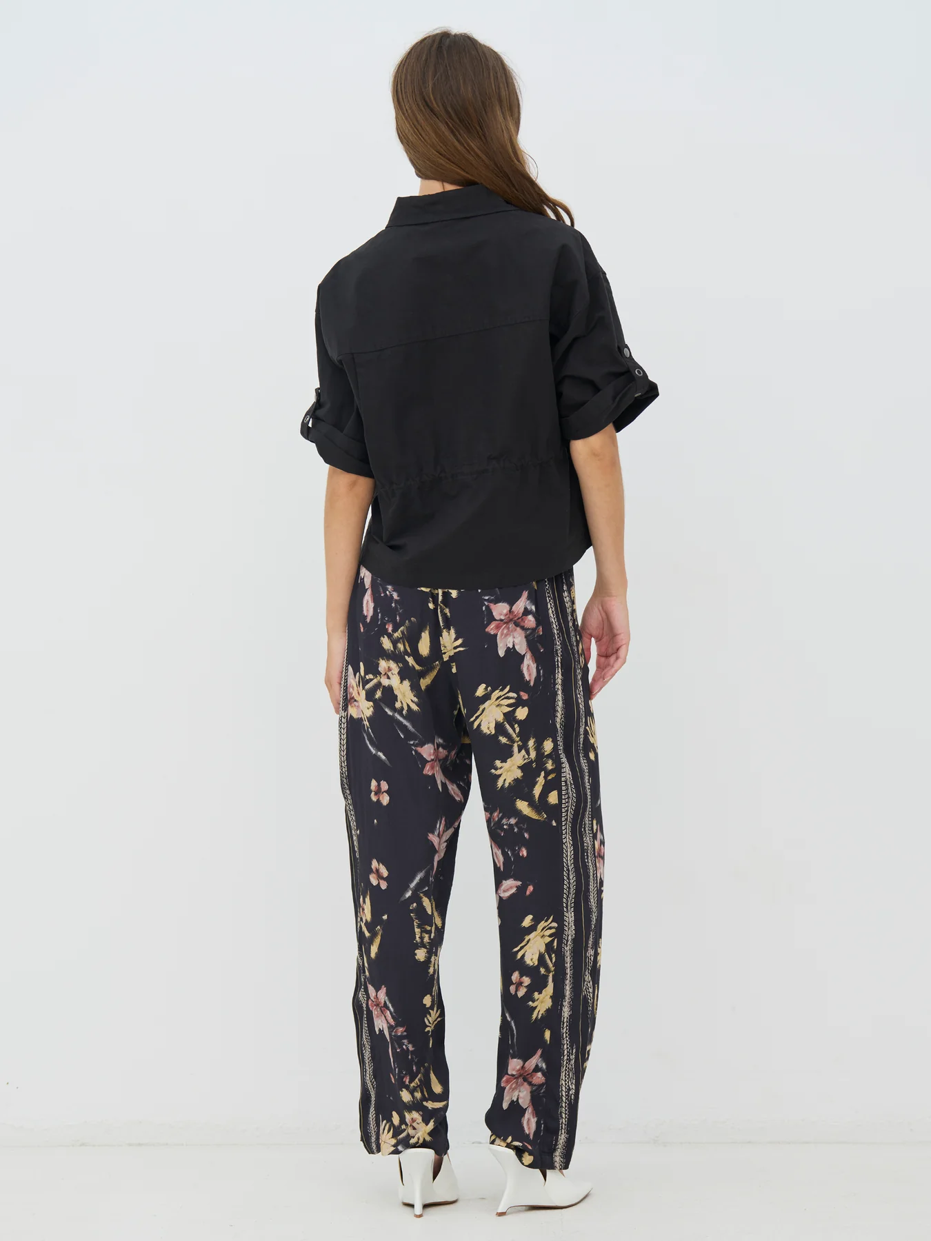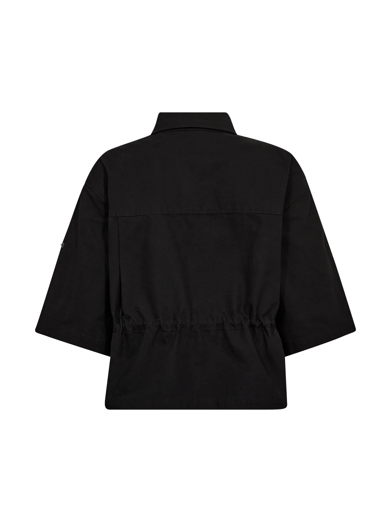 Αυτό το μαύρο πουκάμισο έχει μια ολοκληρωμένη και λειτουργική εμφάνιση με κοντά μανίκια και κλασικό γιακά. Έχει χαλαρή εφαρμογή και μπορεί να φορεθεί και σαν τζάκετ. Κλείνει μπροστά με κουμπιά, ενώ το ρυθμιζόμενο κορδόνι περίσφιξης στη μέση σας επιτρέπει να διαμορφώνετε την εφαρμογή ανάλογα με τις ανάγκες. Οι ελαφριές ζάρες προσθέτουν μια πινελιά κομψότητας, ενώ η πλάτη είναι πιο απλή και ντραπάρει όμορφα. Το πουκάμισο ταιριάζει τόσο κλειστό όσο και ανοιχτό και είναι εύκολο να φορεθεί τόσο με παντελόνι όσο και με φούστες.