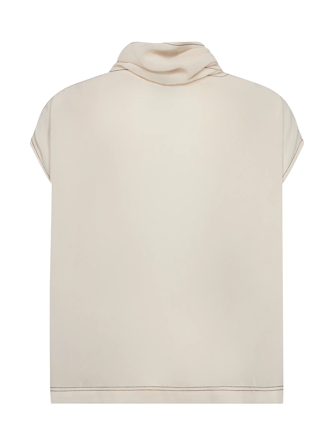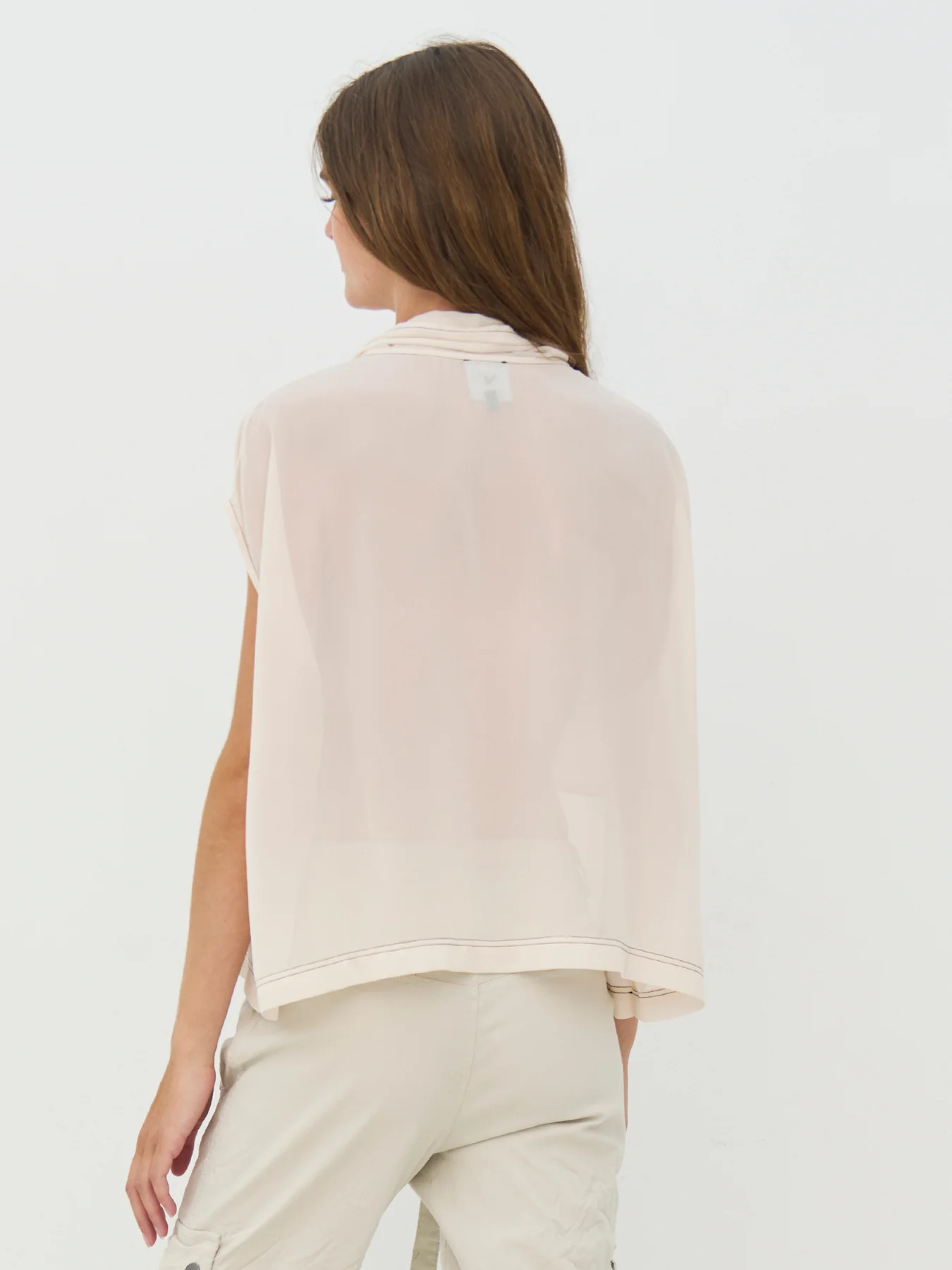 Αυτό το τοπ έχει μια ανάλαφρη, χαλαρή εμφάνιση με άνετη εφαρμογή και κοντά μανίκια που πέφτουν φυσικά πάνω από τους ώμους. Το μπροστινό μέρος χωρίζεται σε πάνελ, δημιουργώντας ένα διακριτικό παιχνίδι στο ύφασμα, ενώ η χαλαρή λαιμόκοψη προσθέτει ένα απαλό, χαλαρό ντραπέ. Η πλάτη είναι απλή και ελαφρώς διαφανής, δίνοντας στο στυλ μια αέρινη και αβίαστη αίσθηση. Συνδυάστε την μπλούζα με ένα χαλαρό παντελόνι ή μια φούστα για μια καθημερινή εμφάνιση που είναι ταυτόχρονα απλή και εκλεπτυσμένη.