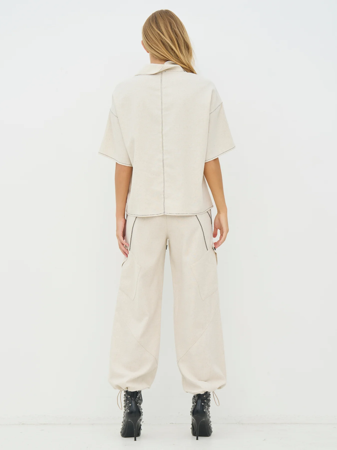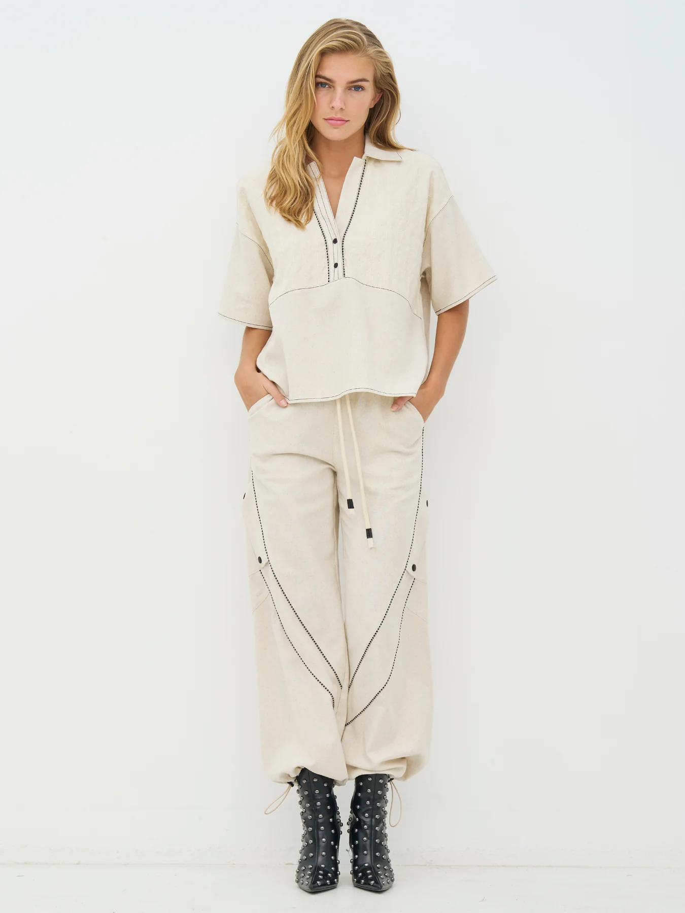 Αυτή η μπλούζα έχει μια χαλαρή αλλά καλοφτιαγμένη εμφάνιση με κοντά μανίκια και άνετη εφαρμογή. Η ανοιχτή λαιμόκοψη με κουμπιά δημιουργεί μια ήρεμη και ευέλικτη εμφάνιση, ενώ οι ορατές ραφές κατά μήκος του μπροστινού μέρους προσθέτουν επιπλέον κομψότητα. Εξαιρετικής ποιότητας υφή, με σχέδιο που είναι πιο απλό στο πίσω μέρος με ορατές ραφές και ίσιο κλείσιμο. Η μπλούζα είναι εύκολη στο styling και μπορεί να φορεθεί είτε μόνη της είτε σε συνδυασμό με το ασορτί παντελόνι για μια ομοιόμορφη εμφάνιση.