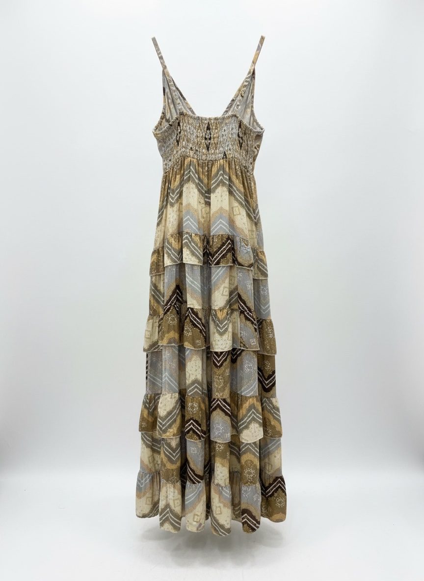 Αέρινο μακρύ φόρεμα με ρυθμιζόμενες ράντες και ελαστική πλάτη/ σφηκοφωλιά. Εντυπωσιακό ντεσέν με χρυσές λεπτομέρειες.