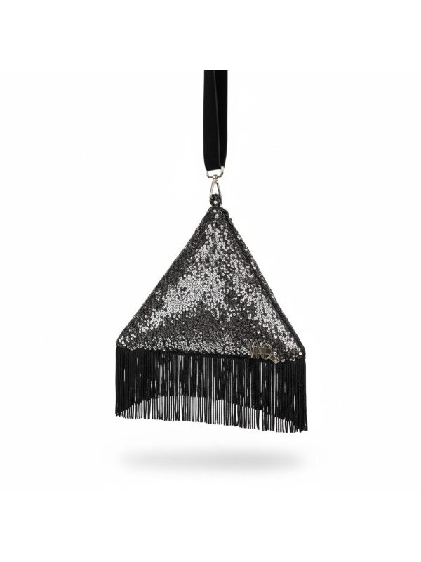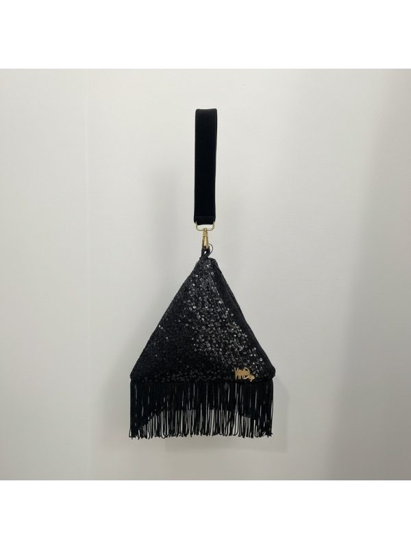 Χειροποίητο τσαντάκι πυραμίδα από λαμπερή gold παγιέτα, διακοσμημένο με κρόσσια για glam κίνηση, φερμουάρ κατά μήκος της μίας γωνίας και βελούδινο λουρί. Ένα εντυπωσιακό αξεσουάρ που ολοκληρώνει τις πιο βραδινές και εκθαμβωτικές εμφανίσεις.