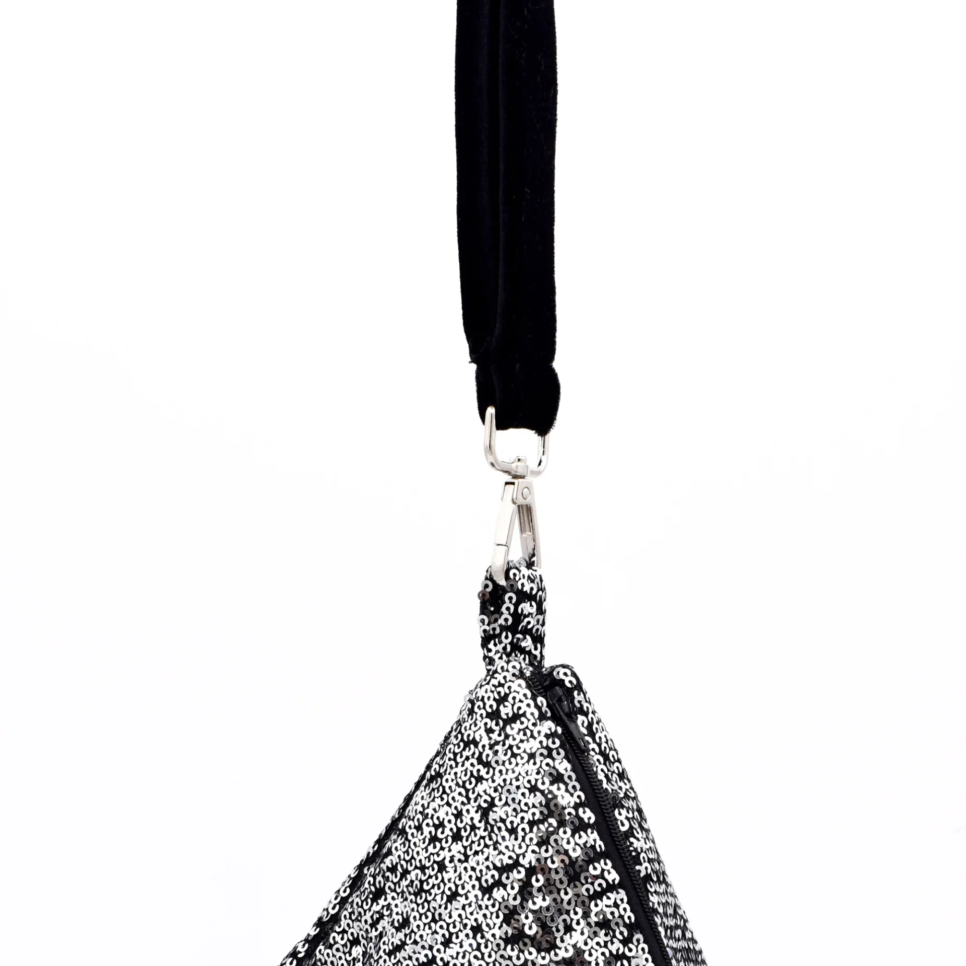 Χειροποίητο τσαντάκι πυραμίδα από λαμπερή silver παγιέτα, διακοσμημένο με κρόσσια για glam κίνηση και βελούδινο λουρί. Ένα εντυπωσιακό αξεσουάρ που ολοκληρώνει τις πιο βραδινές και εκθαμβωτικές εμφανίσεις.